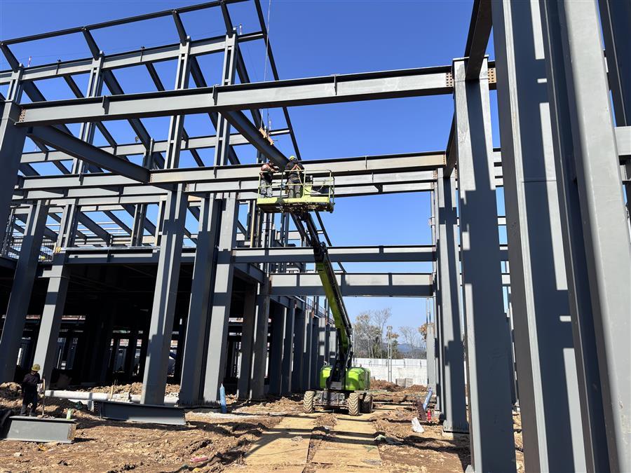 項目施工現(xiàn)場,機(jī)器轟鳴,工程車輛來回穿梭,工人們在各點位開展墊層、樓承板澆筑、鋼筋綁扎、栓釘焊接、基礎(chǔ)砌磚、屋面底板和鋼結(jié)構(gòu)梁柱安裝等施工作業(yè),處處涌現(xiàn)“冬忙”景象。