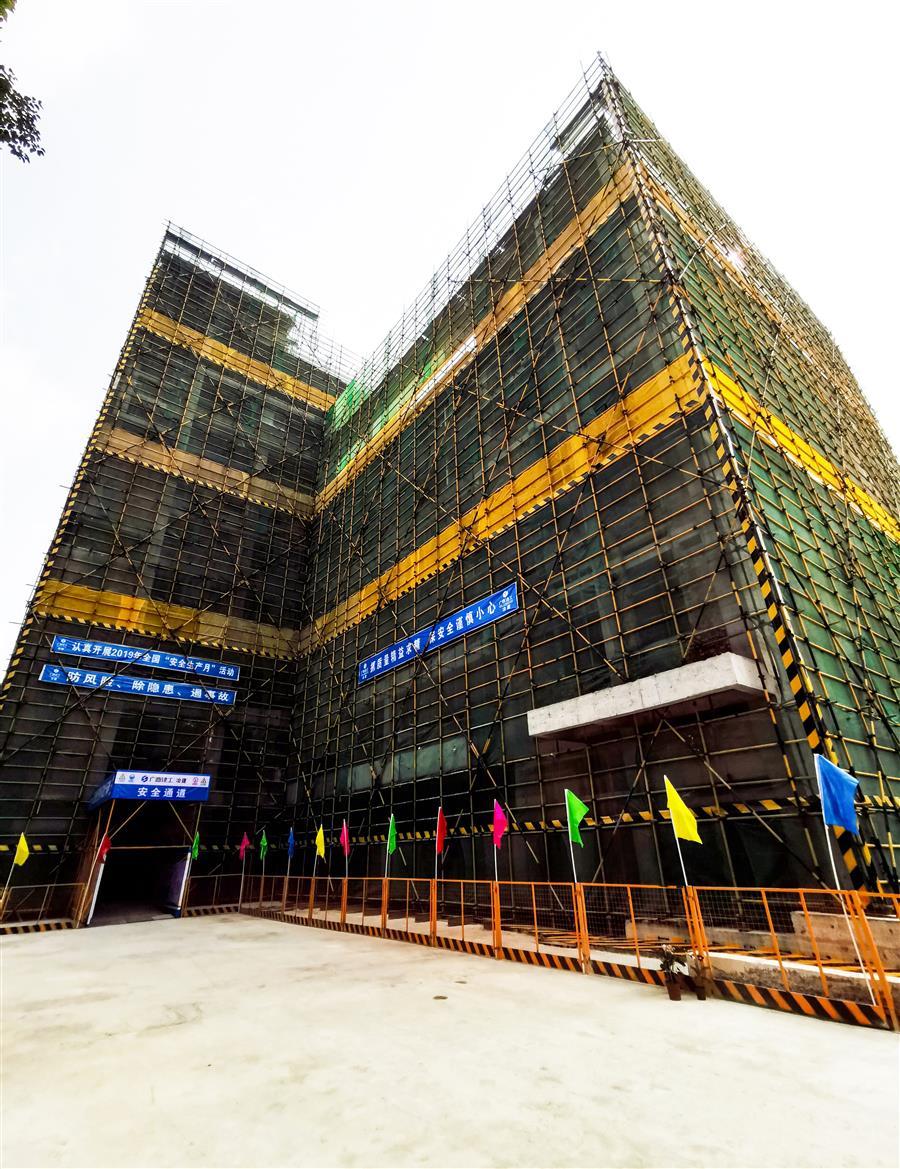 該項(xiàng)目由桂金分公司承建,總建筑面積14993.85平方米,包括1棟9層40.35米高的業(yè)務(wù)綜合樓和1層10.8米高的報(bào)告廳,以及大門、圍墻、供配電、給排水、道路及地面硬化、擋土墻、綠化、醫(yī)療氣體系統(tǒng)等附屬設(shè)施及電梯等設(shè)備購置。目前,項(xiàng)目已完成整體地下室及主樓1~5主體框架結(jié)構(gòu)施工,目前正在進(jìn)行主樓6層內(nèi)架搭設(shè)。