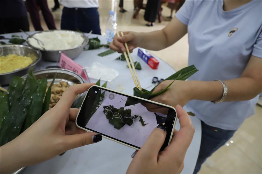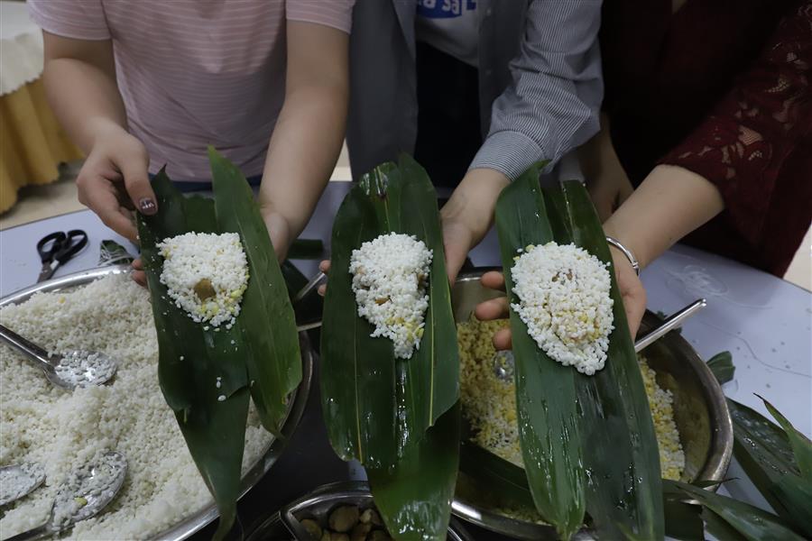 經(jīng)過簡單的現(xiàn)場教學(xué)后,大家領(lǐng)取材料,分組配合,踴躍參與包粽子比賽,只見大家捋粽葉、放餡、封口、扎捆,動(dòng)作一氣呵成,不一會(huì)兒,一只只各式各樣的粽子就在大家手中成型。